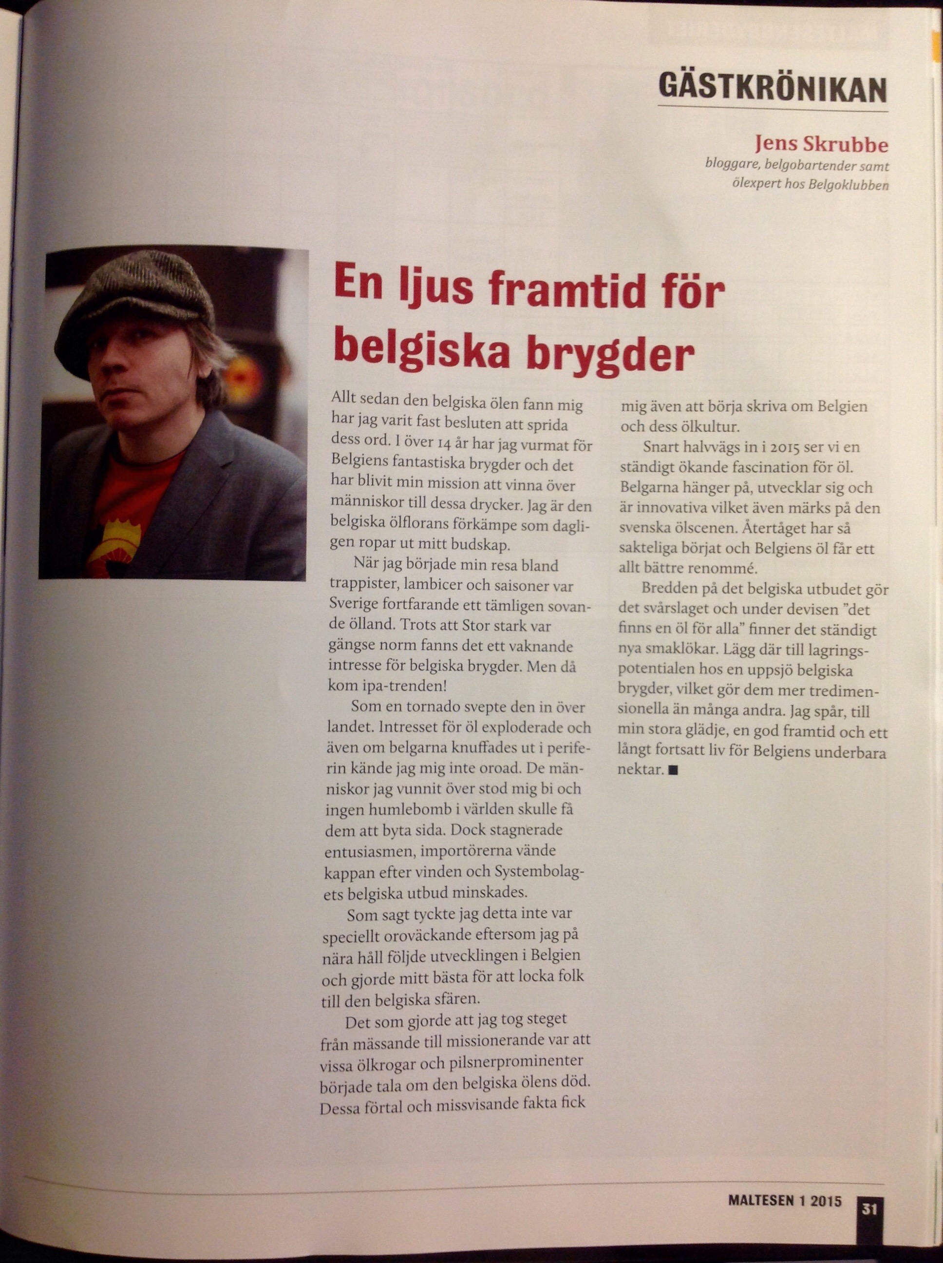 Snart halvvägs in i 2015 ser vi en ständigt ökande fascination för öl, bryggerier växer upp som svampar i jorden och sökandet efter hantverksöl breder ut sig som löpeld. Belgarna hänger på, utvecklar sig och är innovativa vilket märks även på den svenska ölscenen. Återtåget har så sakteliga börjat och Belgiens öl hyser allt större renommé samt att belgiska ölstilar får fäste både här och annorstädes. Bredden på det belgiska utbudet gör det svårslaget och under devisen ‘det finns en öl för alla’ finner den ständigt nya människors smaklökar. Lägg därtill lagringspotentialen som finns i en uppsjö belgiska brygder vilket ger den betydligt mer tredimensionell än många andra länders ölsortiment. Jag spår, till min stora glädje, en god framtid och ett långt fortsatt liv för Belgiens underbara nektar.