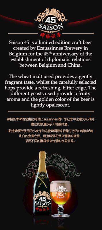 Vidare genom flödet noterade jag att det tämligen ojämna bryggeriet Ecaussinnes som även har för vana att krydda sina produkter med allt mellan himmel och jord brygger en jubileumsöl. Detta är bryggeriets första Saison och den har fått namnet Saison 45 eftersom det är 45 år sedan Belgien och Kina etablerade en diplomatisk relation. Det finns alltid en anledninga att släppa en ny öl även om man får lita lite i historien…