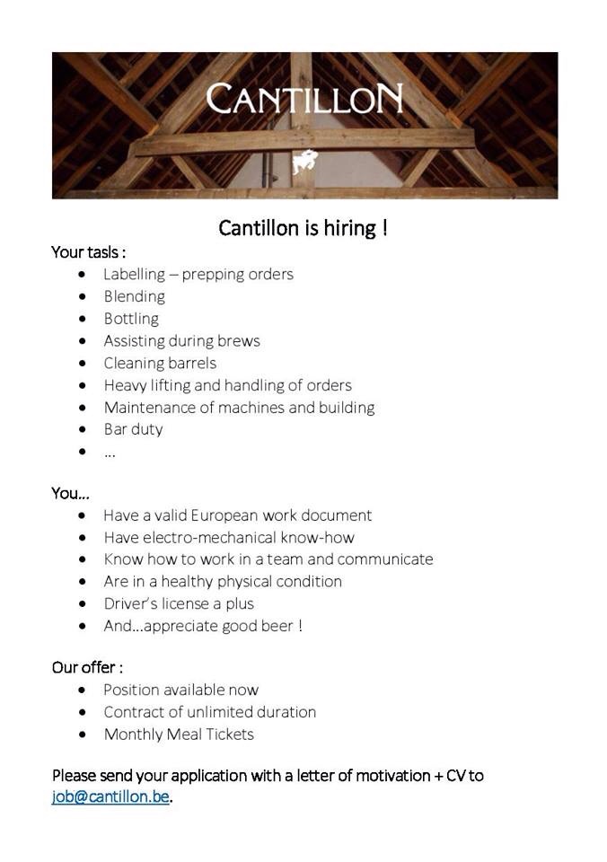 Igår utlyste ett av Belgiens hippaste och mest omsusade bryggeri en tjänst. Det är det Brysselbelagda lambicbryggeriet Cantillon som behöver personal och jag förutsätter att de kommer att översvämmas av ansökningar!