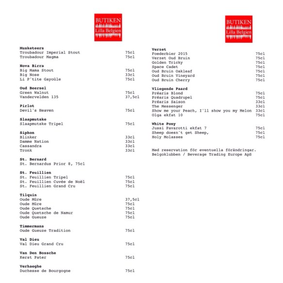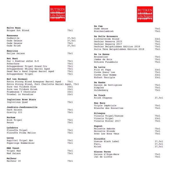 Butiken innehåller ett gediget urval av den belgiska ölfloran och eftersom vi vet att det kan vara svårt att få med sig allt man inhandlar erbjuder vi en möjlighet att få det ölen hemkörd till önskad adress. Nedan följer de långt över 100 brygder som finns att införskaffa. Antal exemplar av dessa produkter varierar och priserna kommer att spänna mellan ca 30 – 300 kronor.