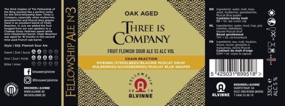 The third chapter of ”The Fellowship of the Ring” seemed like a perfect name for this third fellowship beer. ‘Three is Company’, especially when mulberries, gooseberries and Muscat blue grapes meet in an excellent barrel of Chain Reaction. In July (2018) we added the fruits foraged from our own gardens to a Chateau Daisy Vedrines (Sauternes) sweet white wine barrel. Chain Reaction was Aged for 18 months in this second time used French osk barrel. (Yet to be bottled)