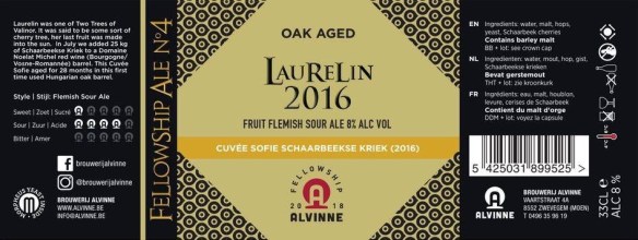 Laurelin was one of the Two Trees of Valinor. It was said to be some kind of cherry tree, het last fruit was made into the sun. In July (2018) we added 25 kg of Schaarbeekse Kriek to a Domaine Harmand Geoffroy (Bourgogne/Gevrey-Chambertin) red wine barrel. This Cuvée Sofie Aged for 16 months in this third time used French oak barrel. (510 bottles)