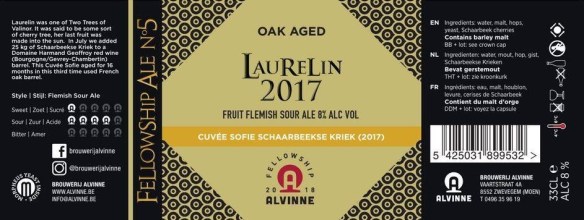 Laurelin was one of the Two Trees of Valinor. It was said to be some kind of cherry tree, het last fruit was made into the sun. In July (2018) we added 25 kg of Schaarbeekse Kriek to a Domaine Noelat Michel (Bourgogne/Vosne-Romanée) red wine barrel. This Cuvée Sofie Aged for 28 months in this first time used Hungarian oak barrel. (443 bottles)
