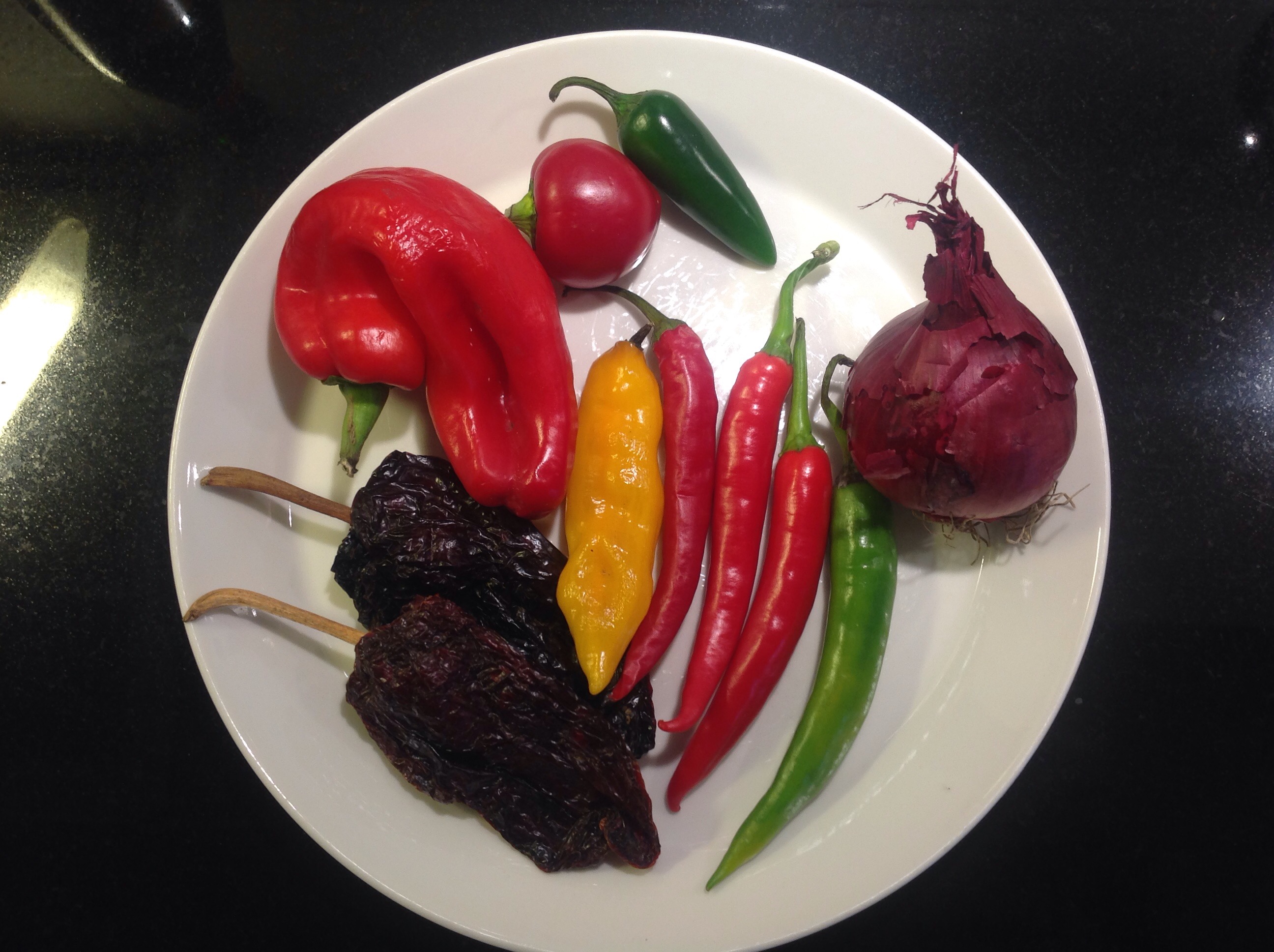 250 -300 g chilifrukter (jag valde även att inkludera rödlök och röd paprika men annars använde jag röd och grön chili, jalapeno, cherry bomb, limo och ancho)