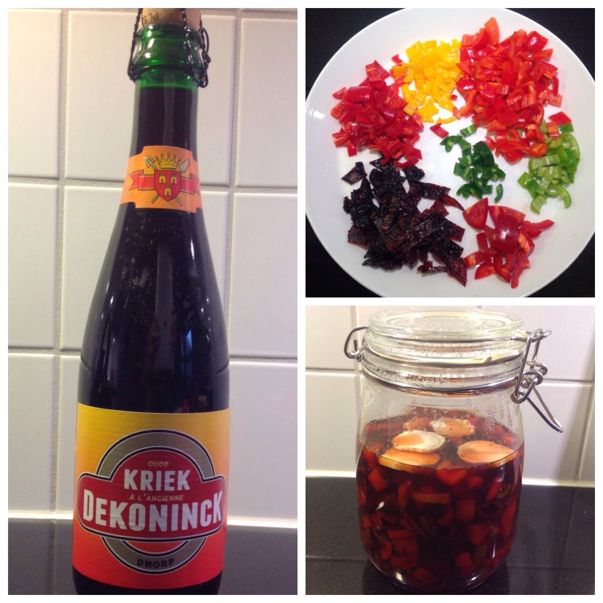 Sagt och gjort. Självklart måste inläggningen involvera belgisk öl och valet föll på den otickade De Koninck Oude Kriek som numer bryggs av Boon.