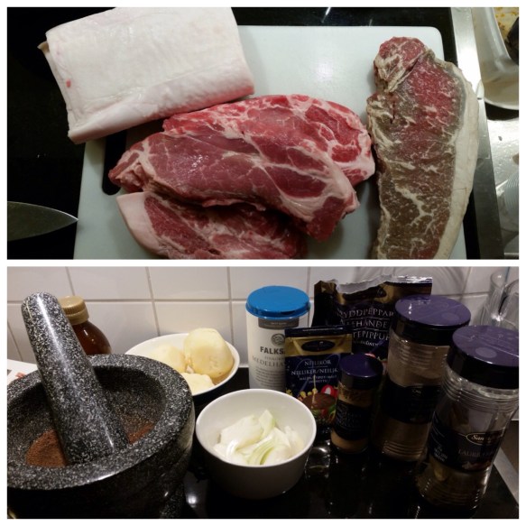 1. Mal köttet två gånger i köttkvarnen. Under andra vändan låter ni späcket, potatisen och löken gå med.