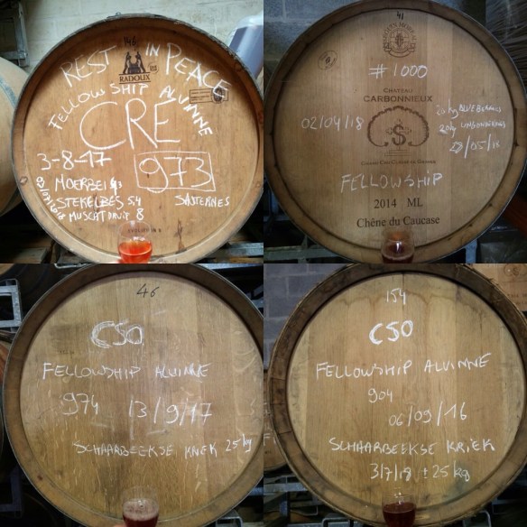 ”Cuvée Anna is a Flemish Catalan Sour Ale aged on red wine barrels from Château l’Ermitage. Cuvée Anna is the outcome of our brew with Anna and Anna. The beer has been fermented with our wild house yeast culture Morpheus. We kegged an exclusive single barrel version of Cuvée Anna that premiered at Borefts Bier Festival 2019. We will give some more time to 4 other barrels, those will be bottled later. One barrel will end up in a Fellowship project with some fresh Plums and Blackberries. The beer will have aged for over a year in total, the fruits will have macerated for over 4 months. At the moment we added 15kg of handpicked fresh Plums and 3 kg of handpicked fresh Blackberries to the Fellowship project barrel, more will be added soon.”