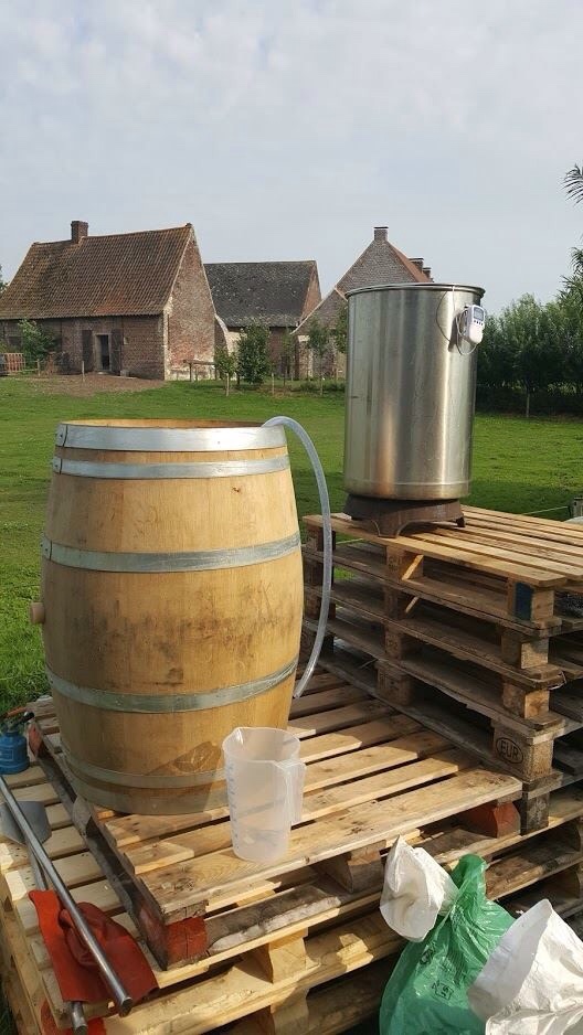 ”We have blended our Belgian Quad Land Van Mortagne 12.8% and our Barley Wine Pays d’Erpigny 11% and put them on a Red Wine St-Emilion, Amercian Oak barrel. The beer has been aging for 8 months now and will get some more time. We added freshly dried figs that we picked and dried ourself. ”