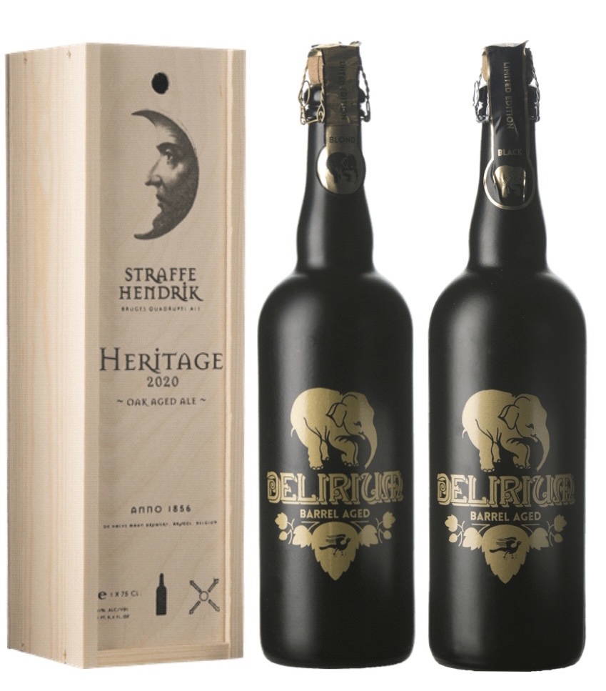 Produkt två samt tre kommer från bryggeriet Huyghe och är för oss svenska två helt nya muskedunder att sätta tänderna i. Denna duo av svartbeklädda buteljer med guldpläterade elefanter är även de ekfatslagrade och bägge pjäserna har mognat på Bourbonfat i nio månader. Flaskan i mitten har bryggeriets flaggskepp Delirium Tremens som grund och efter fatlagringen byts namnet till Delirium Blond Barrel Aged. Den sista flaggan har förädlats med en blandning av bryggeriets mörka doning Delirium Nocturnum och deras julöl Delirium Noël. Efter tiden på fat får denna pangprodukt namnet Delirium Black Barrel Aged.