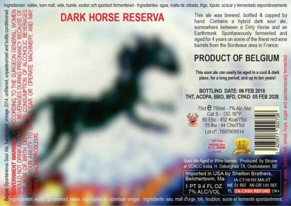 Den första produkten som går under namnet Dark Horse Reserva är en spontanjäst brygd som legat fyra år på Bordeauxfat. Denna rika och vinösa pjäs är enligt bryggeriets egna utsago en hybrid av deras första Oud Bruin som hette Aardmonnik och ett lambicliknande experiment Urbain Coutteau skapade 1983 vid namn Dirty Horse. Det är en synnerligen karaktärsfull öl som kommer lämna få oberörda. I min bok är den värd den väl tilltagna slanten men jag anar att inte alla kommer att hålla med mig…