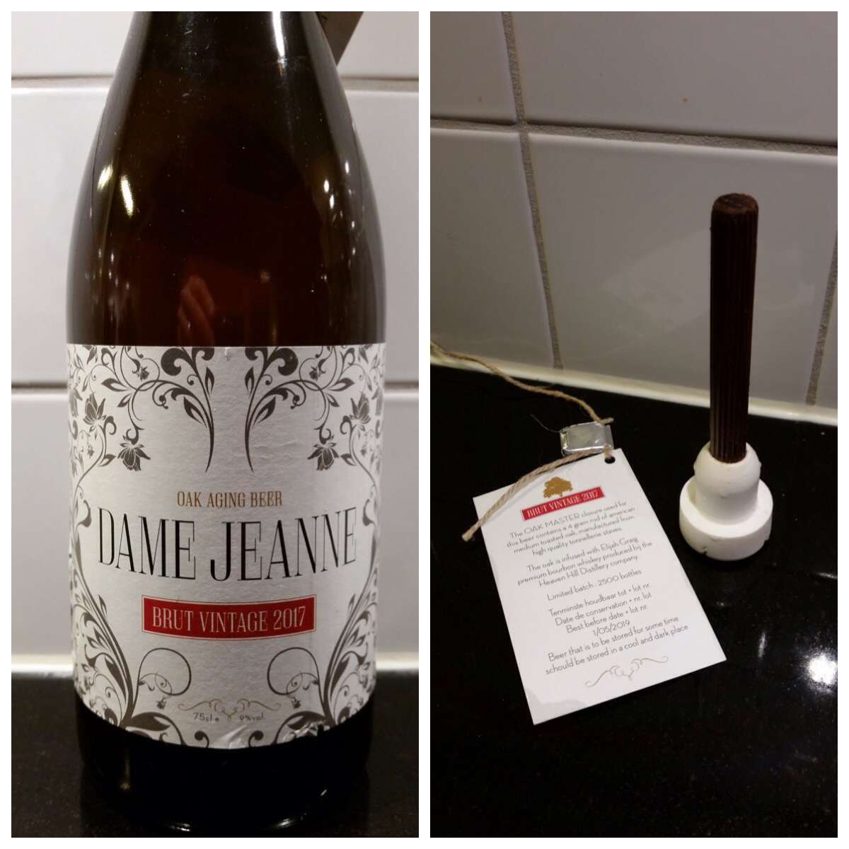 Intet ont anande öppnade jag under gårdagen en flaska Dame Jeanne Brut Vintage 2017 som är bryggd på Triest för ett fantombryggeri under namnet Dame Jeanne. De sistnämnda har specialiserat sig på champagneöl och är belägna i Brasschaat strax norr om Antwerpen. Märk av min förvåning när jag avlägsnar korken och det sitter en 10 cm trästav i den. Denna ‘ekfatslagrade’ produkt har alltså inte legat på ekfat utan fatlagringen består i denna lilla träbit av medelrostad amerikansk ek som doppats i Bourbon (Elijah Craig/Heaven Hill). Detta gav mer smak än vad jag anade från början och mot slutet blev vaniljtonerna nästan överväldigande. Hur som helst gillar jag tanken men framförallt gillar jag att fortfarande bli överraskad!