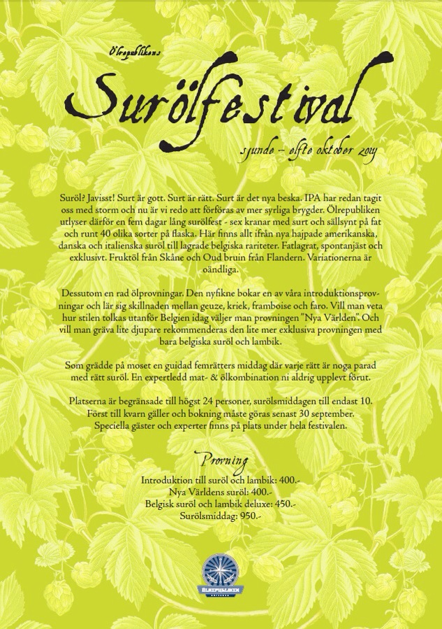 Likt förra året kommer vi att ha en Surisbar där vi kommer att presentera en uppsjö Lambicer, Oud Bruins, Versnijbier och dylika härligheter. Totalt kommer vi ha 64 olika brygder i dessa olika stilar. Av dessa är det några som jag är extra stolt och glad över att vi har kommit över eftersom dessa är antingen nya, ovanliga eller udda.
