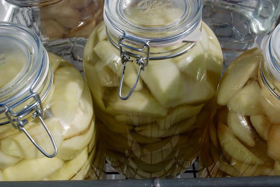 Nu tar de ytterligare ett kuinariskt steg. För några veckor sedan plockade bryggeriet dessa päron och efter mognad har de nu fått ett nytt hem. Skalade och urkärnade ligger de numer tillsammans med 72 %-igt Pannepot-destillat från 2015 på glassburkar.