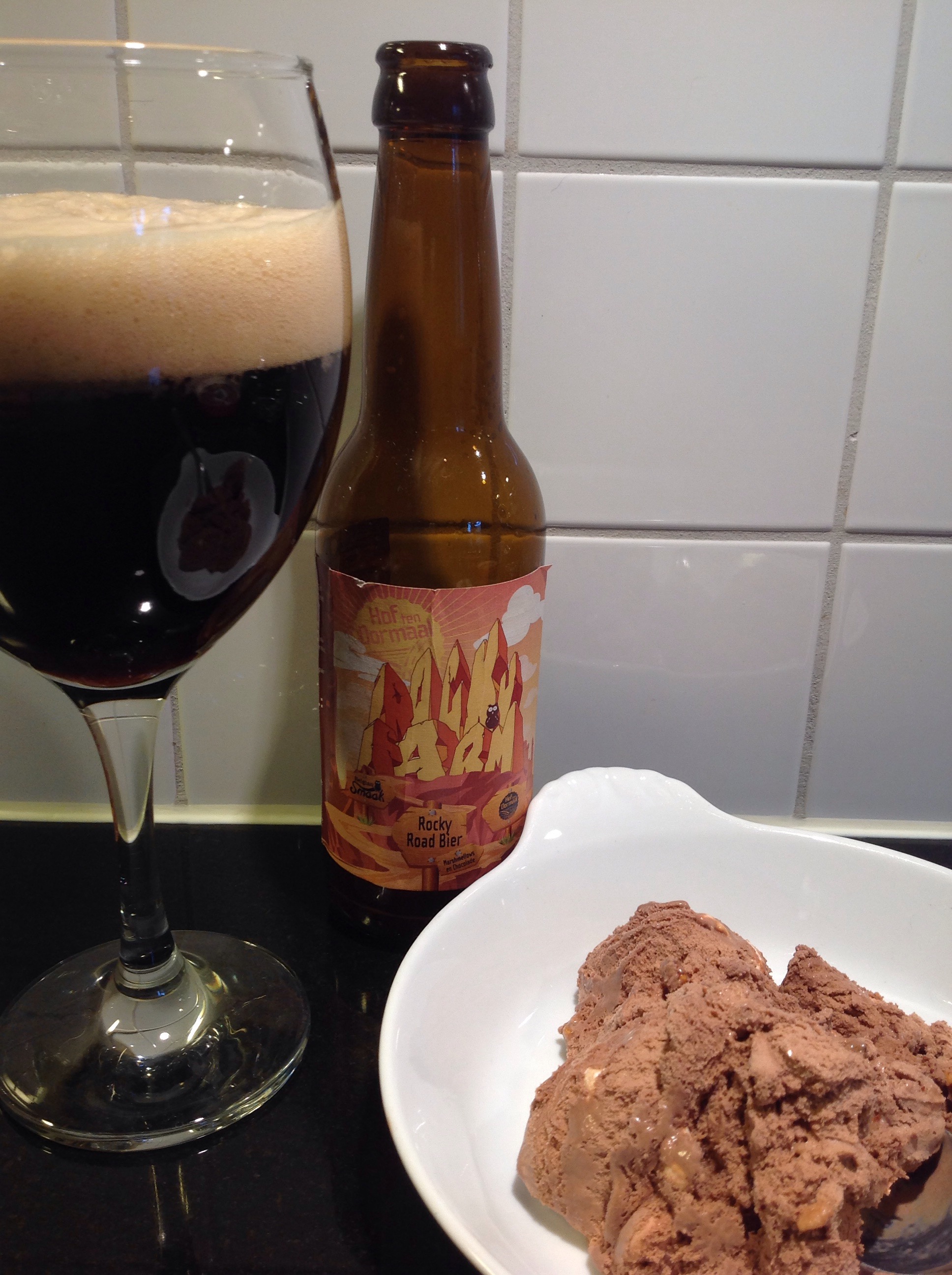 Experiment nummer två gick betydligt fortare eftersom jag inte orkade göra egen Rocky Road-choklad utan köpte glass med den smaken vilket innebar att jag bara behövde skopa och hälla upp. Tidigare i våras bryggde Hof ten Dormaal tillsammans med Belgian Smaak en Rocky Road-öl som fick namnet Rocky Farm. Så här i efterhand inser jag att ölen hade passat bättre med chokladbiten än med glassen dock fanns det en syra i ölen som förtog känslan en aning.