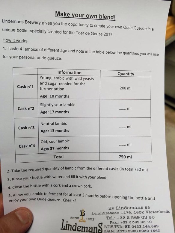 Ytterligare ett bevis på detta dök upp nu i kväll. De deltagarna som hade Lindemans på sin rutt fick nämligen möjlighet att blanda sin egen unika Oude Gueuze! Vilken fantastisk idé och ett fruktansvärt roligt tilltag. Först provsmakade man fyra olika lambicer som lagrats olika länge…